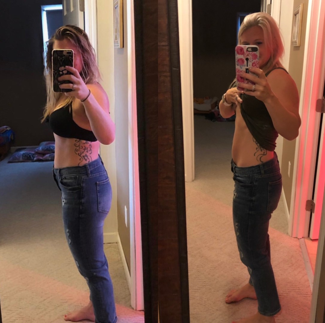 There are a couple differences between these pictures. The one on the left was taken at the end of March and the one on the right was taken last week. This is from 2 months post partum to 7 months post partum. These jeans were definitely on my list of hope to fit into them better eventually and I put them on last week after not wearing them for quite some time and actually thought they were a different pair then I was like no way that they’re this loose so I washed and dried them and put them on and GUESS WHAT? They are indeed loose. Non scale victories are sometimes the most rewarding! Also, this is true proof that results take time, it’s a process. Leading and living a healthy lifestyle takes work and consistency, there is no easy fix. It’s easy to get wrapped up about the number on the scale or the battle of what your goals are. I think sometimes our expectations are set too high and we just need to remember our goals are OUR GOALS! We are each so different and everyones goal is so individualized and that’s what makes the journey with the challenges and strategies the most rewarding once we reach a goal!